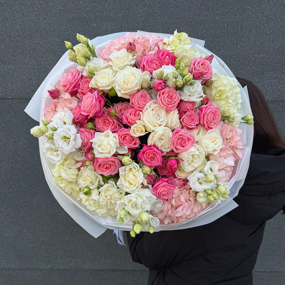 W bukiecie połączono sezonową hortensję, różowe róże gałązkowe, kremowe i różowe róże klasyczne oraz świeżą eustomę. To harmonijne zestawienie delikatnych tekstur i pastelowych barw. Miękkie przejścia kolorystyczne oraz pełna forma tworzą luksusowy efekt, który przyciąga wzrok i zachwyca elegancją.