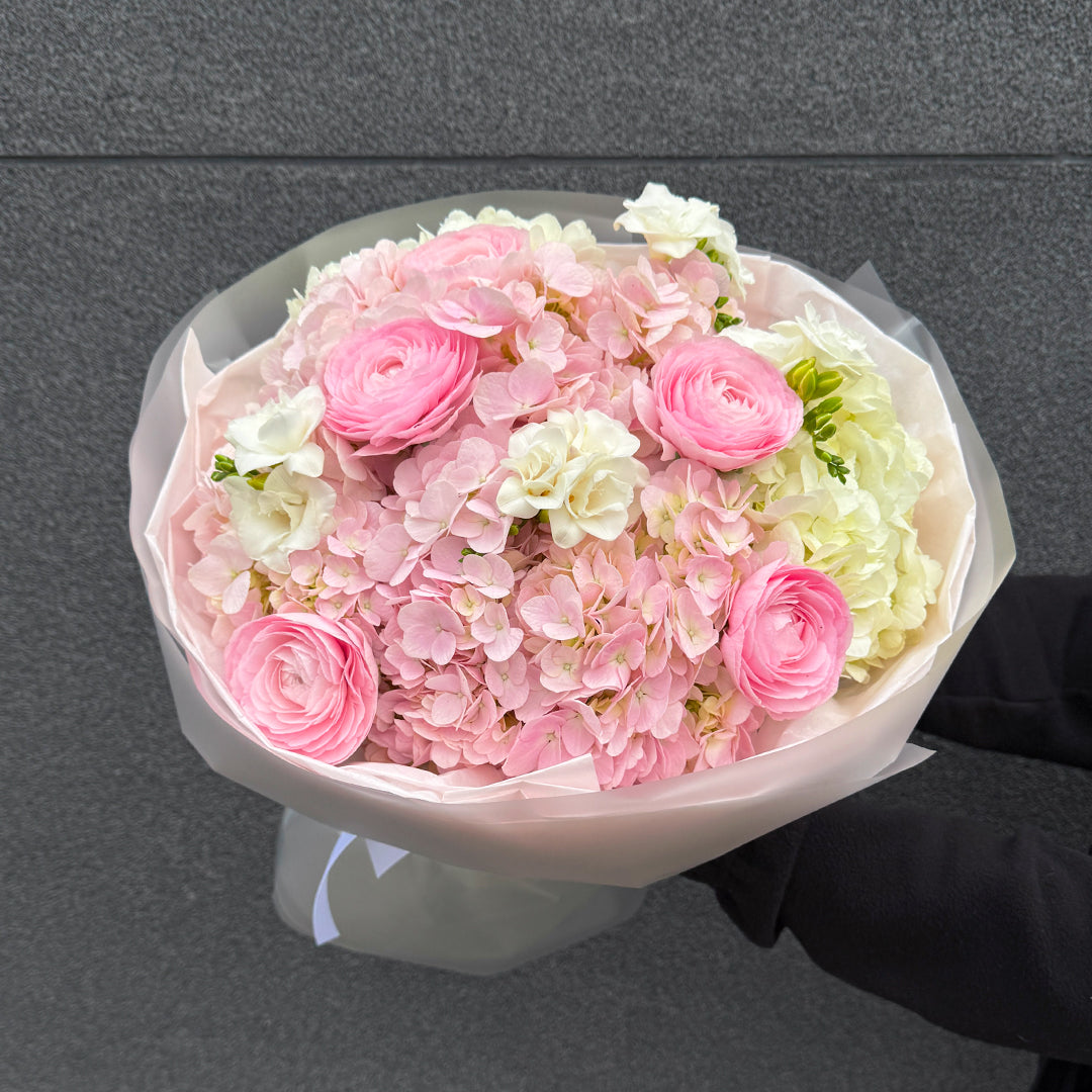Romantyczny bukiet z różowych ranunculusów, pachnącej frezji i delikatnej hortensji to kompozycja pełna lekkości, harmonii i pastelowej elegancji. Połączenie miękkiego różu, kremowej bieli i pudrowych tonów nadaje całości spokojny, naturalny charakter.
