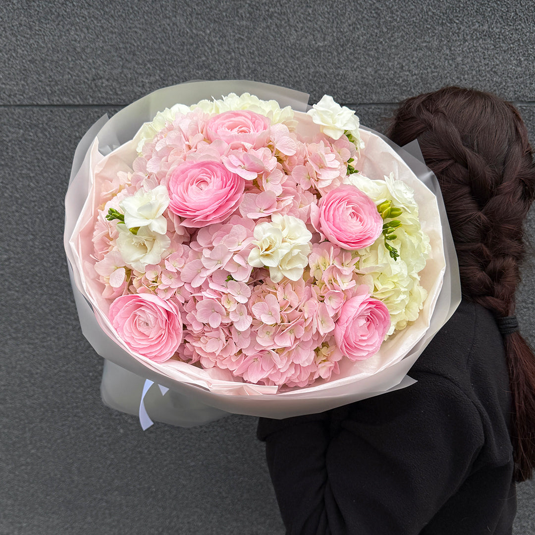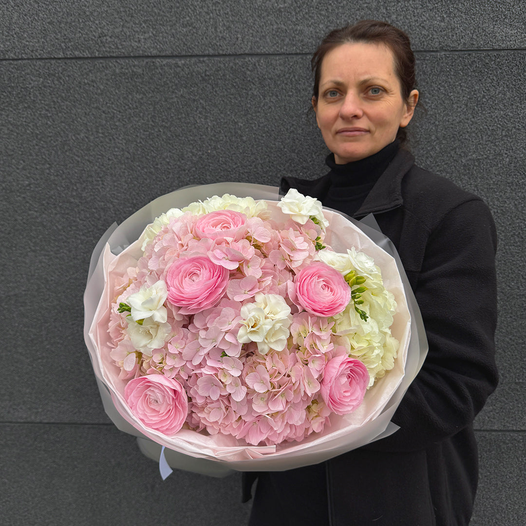 Różowe ranunculusy zachwycają pełną formą i subtelnym romantyzmem, frezja dodaje lekkości i delikatnego zapachu, a hortensja wprowadza miękkość i objętość. Każdy bukiet przygotowujemy ręcznie z kwiatów premium, dbając o świeżość, estetykę i eleganckie proporcje. To idealny wybór dla osób ceniących pastelowe barwy i wyrafinowany styl.