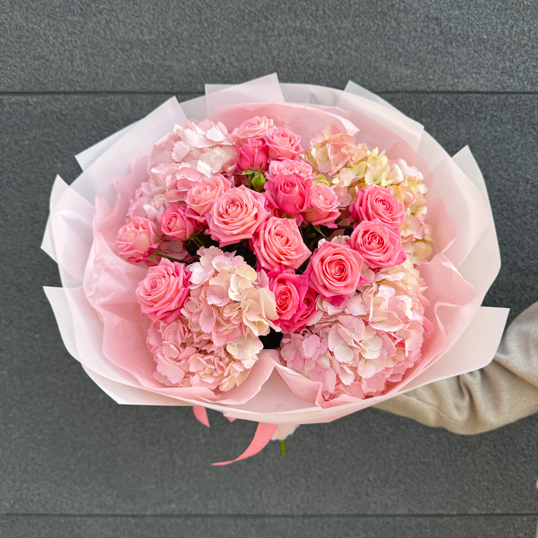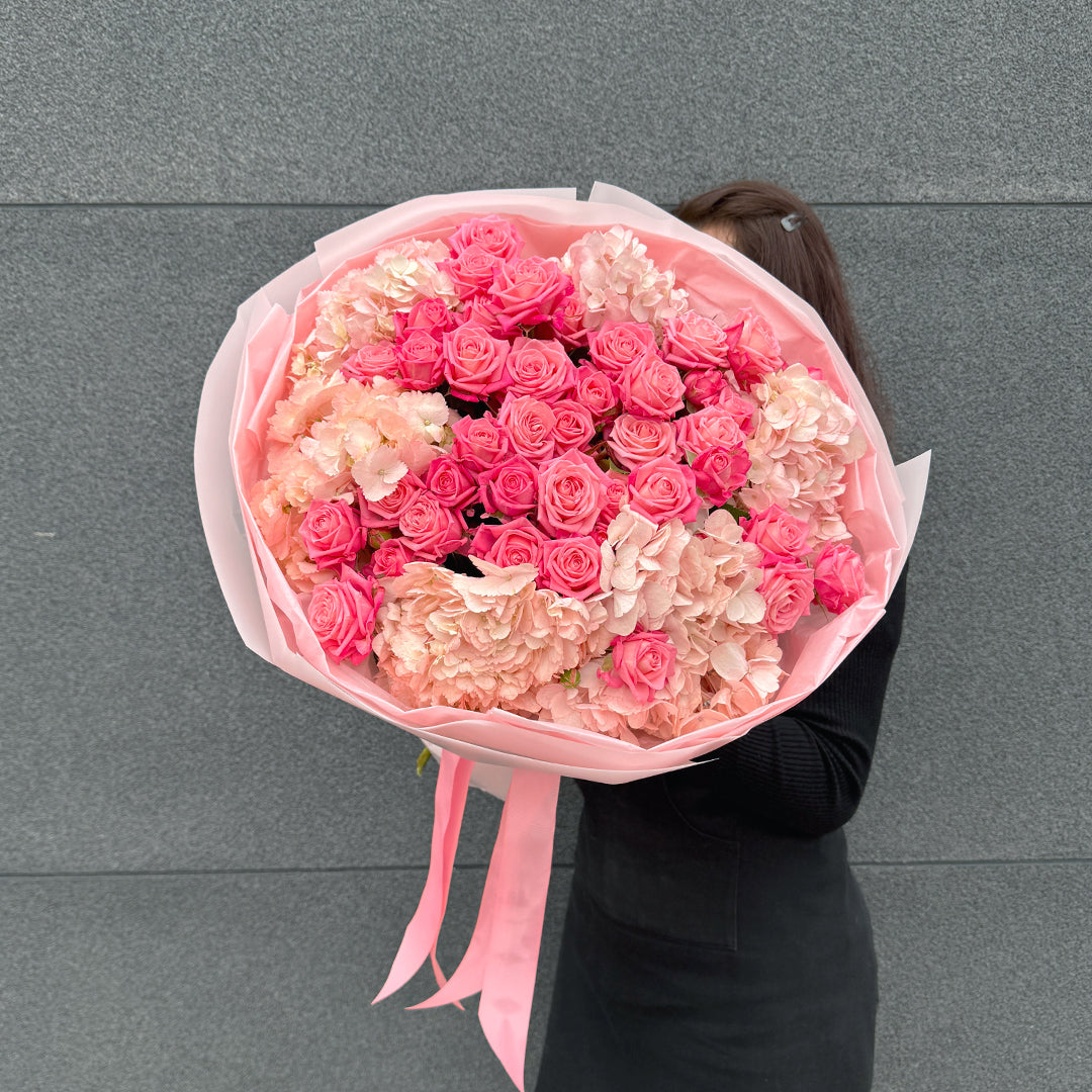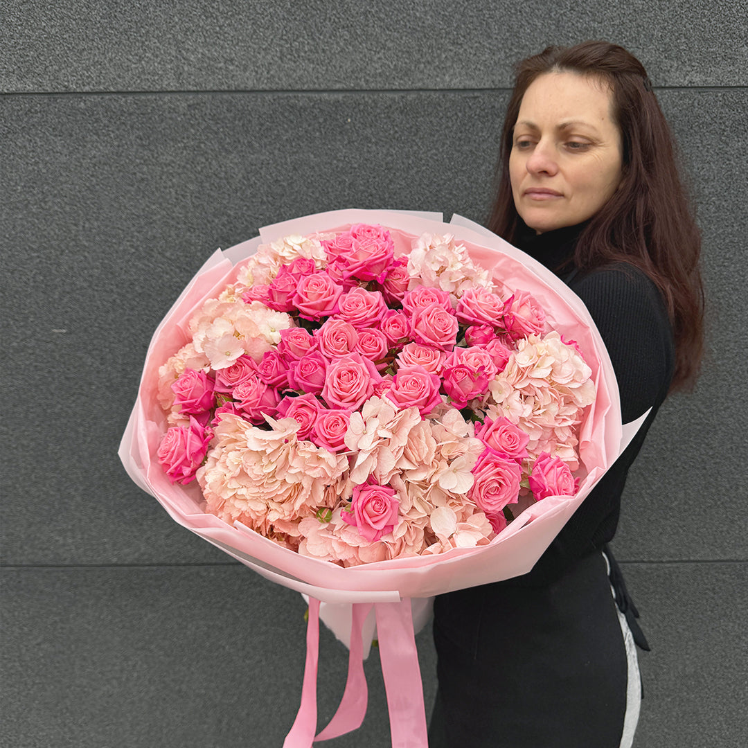 Na zdjęciu prezentujemy bukiet wykonany z różowych hortensji oraz róż gałązkowych w różnych odcieniach różu – od pastelowego po intensywny. To luksusowa, kobieca kompozycja o imponującej objętości i harmonijnym charakterze. Delikatne przejścia kolorystyczne oraz miękkie, kwiatowe linie tworzą wrażenie eleganckiej kwiatowej chmury.