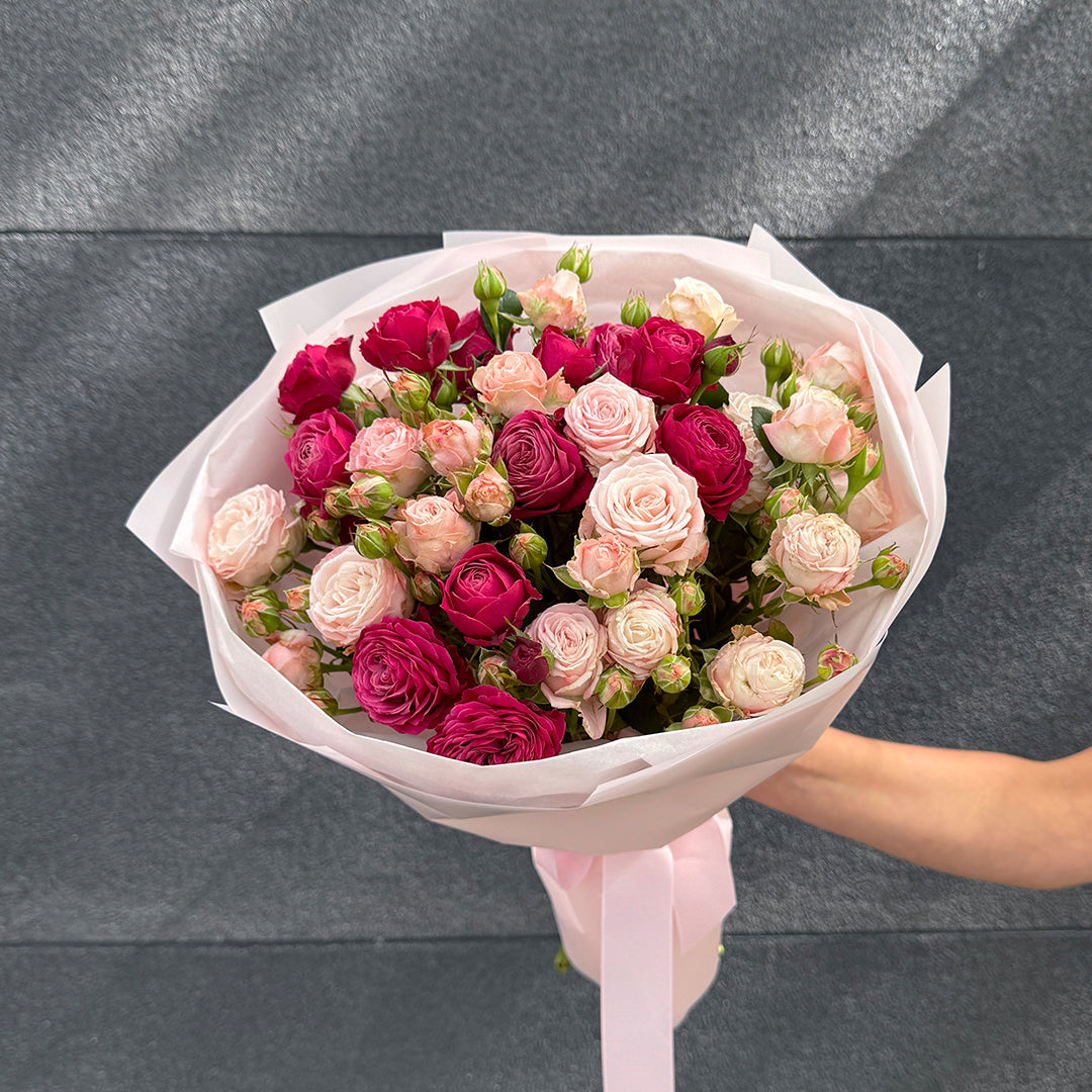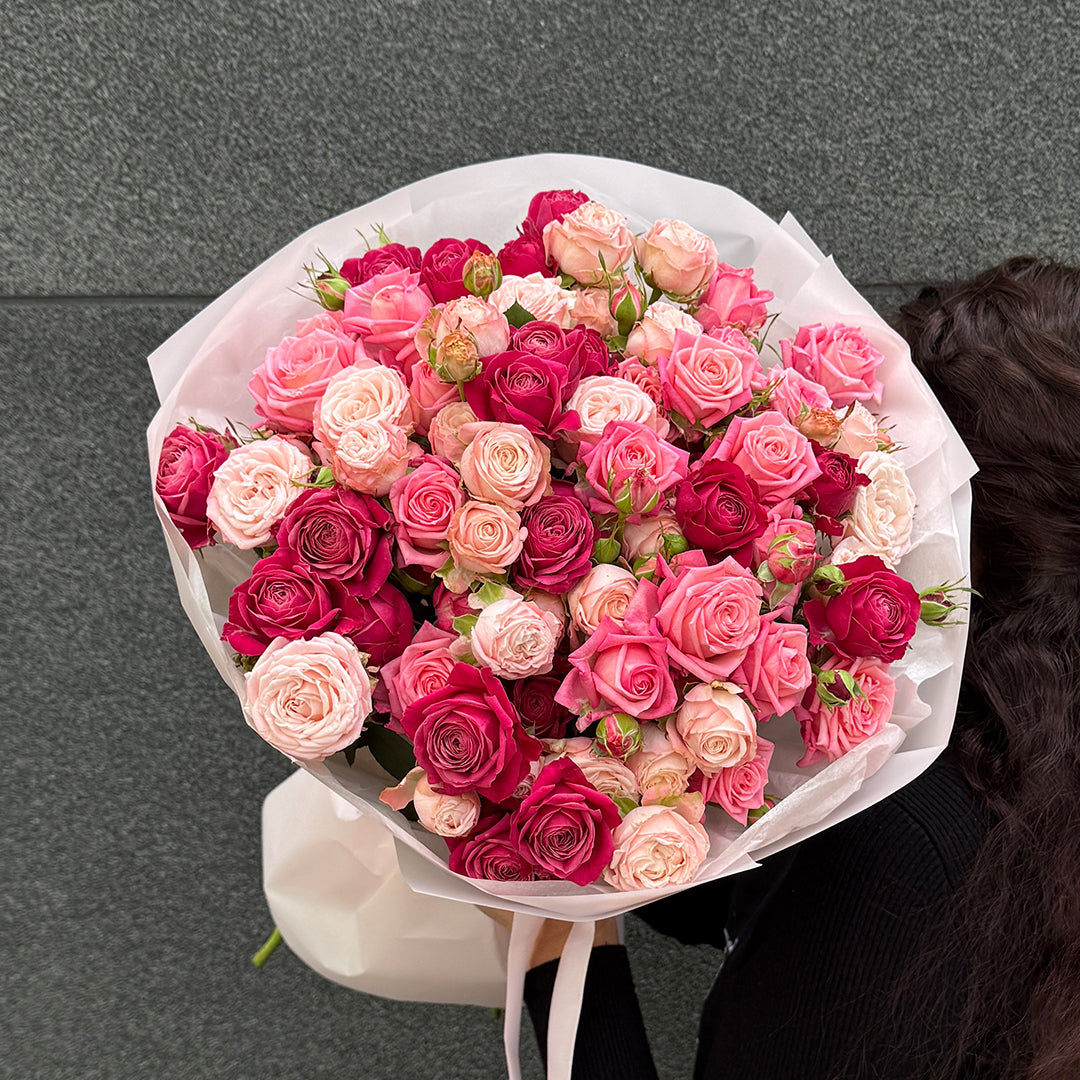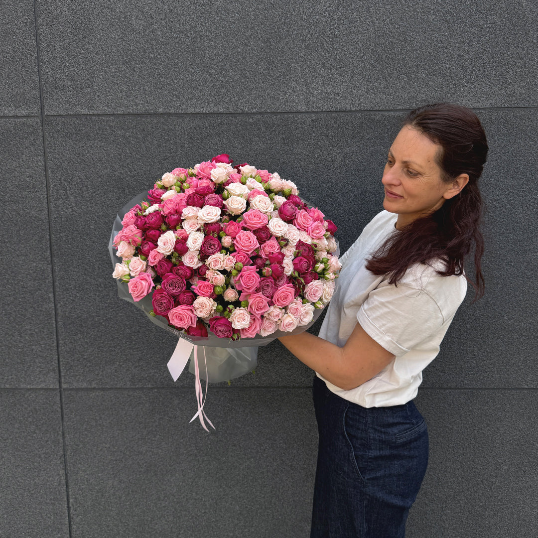 Mieszanka kilku odcieni różu i kremu tworzy efektowną, pełną i bardzo elegancką kompozycję. Każda gałązka posiada wiele pąków, dzięki czemu bukiety są wyjątkowo puszyste i prezentują się imponująco na żywo.