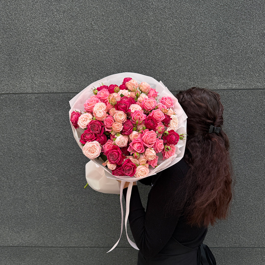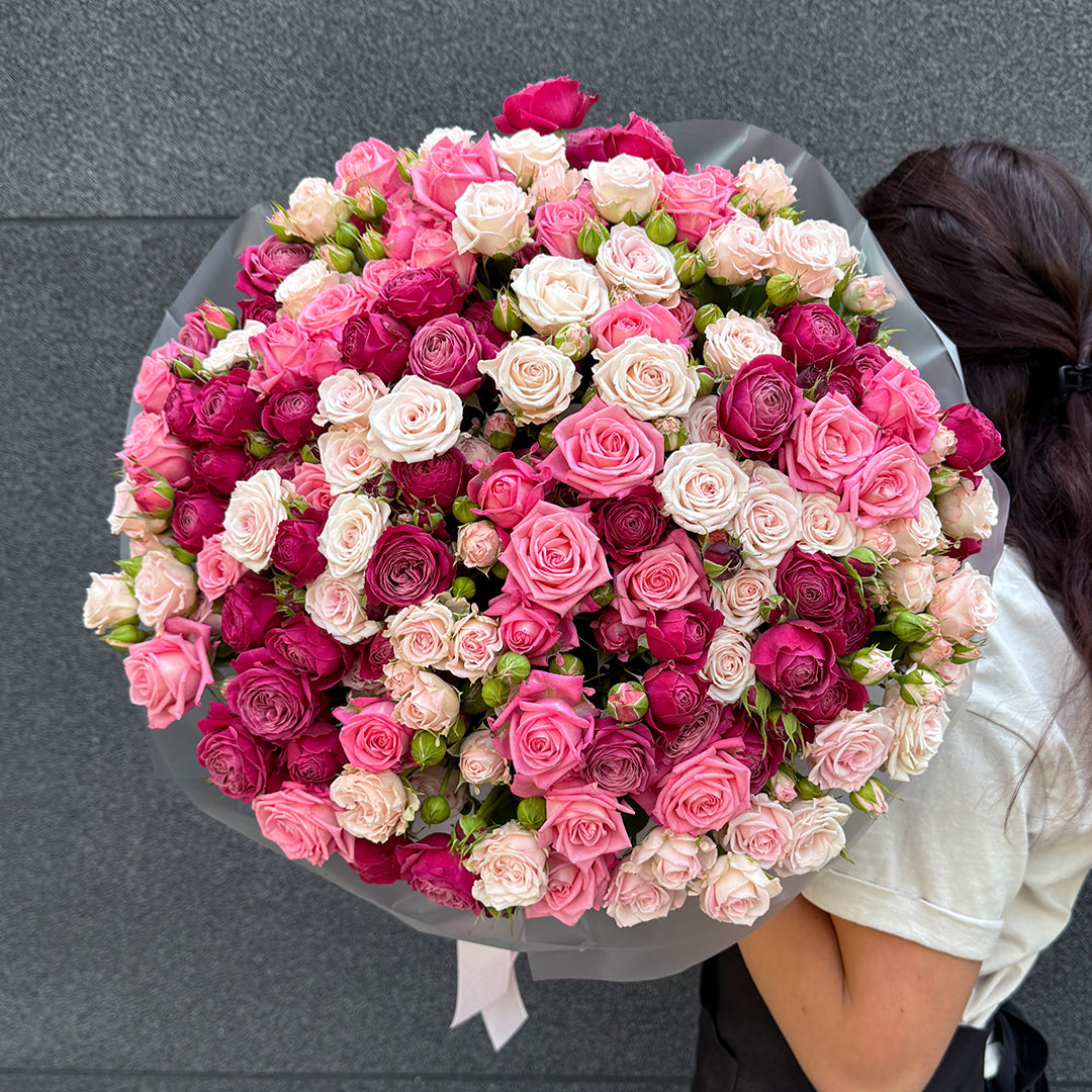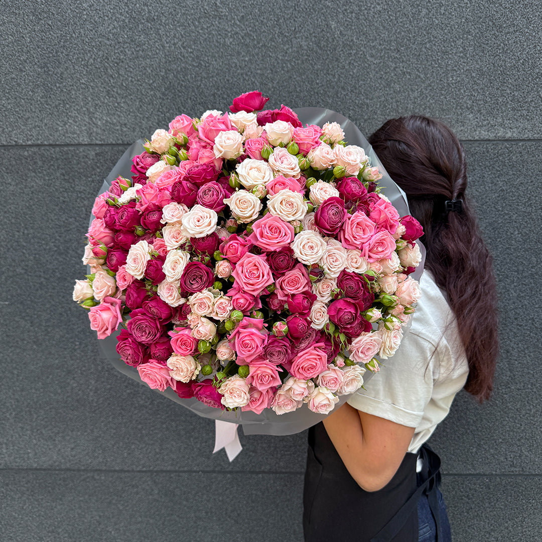 Mieszanka kilku odcieni różu i kremu tworzy efektowną, pełną i bardzo elegancką kompozycję. Każda gałązka posiada wiele pąków, dzięki czemu bukiety są wyjątkowo puszyste i prezentują się imponująco na żywo.