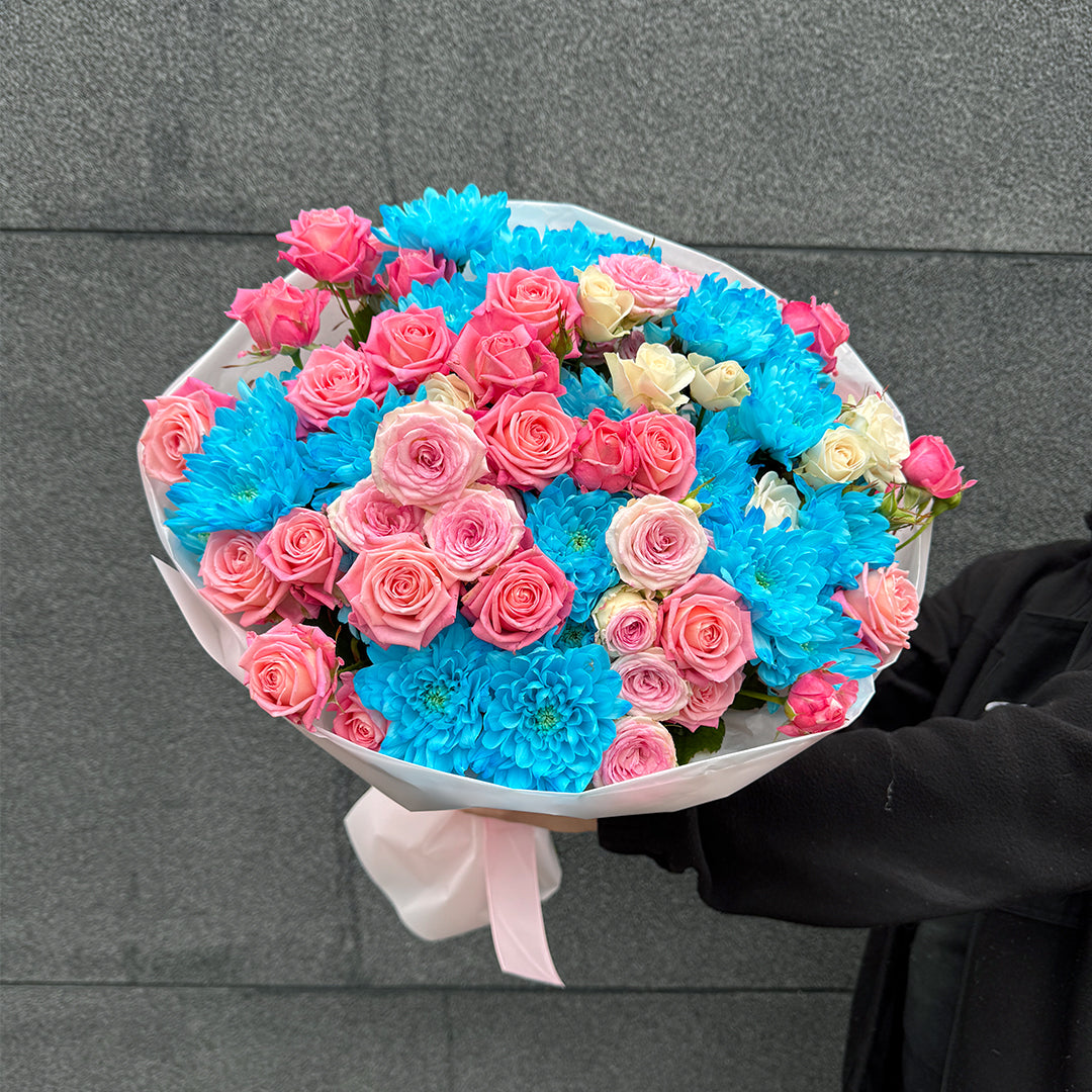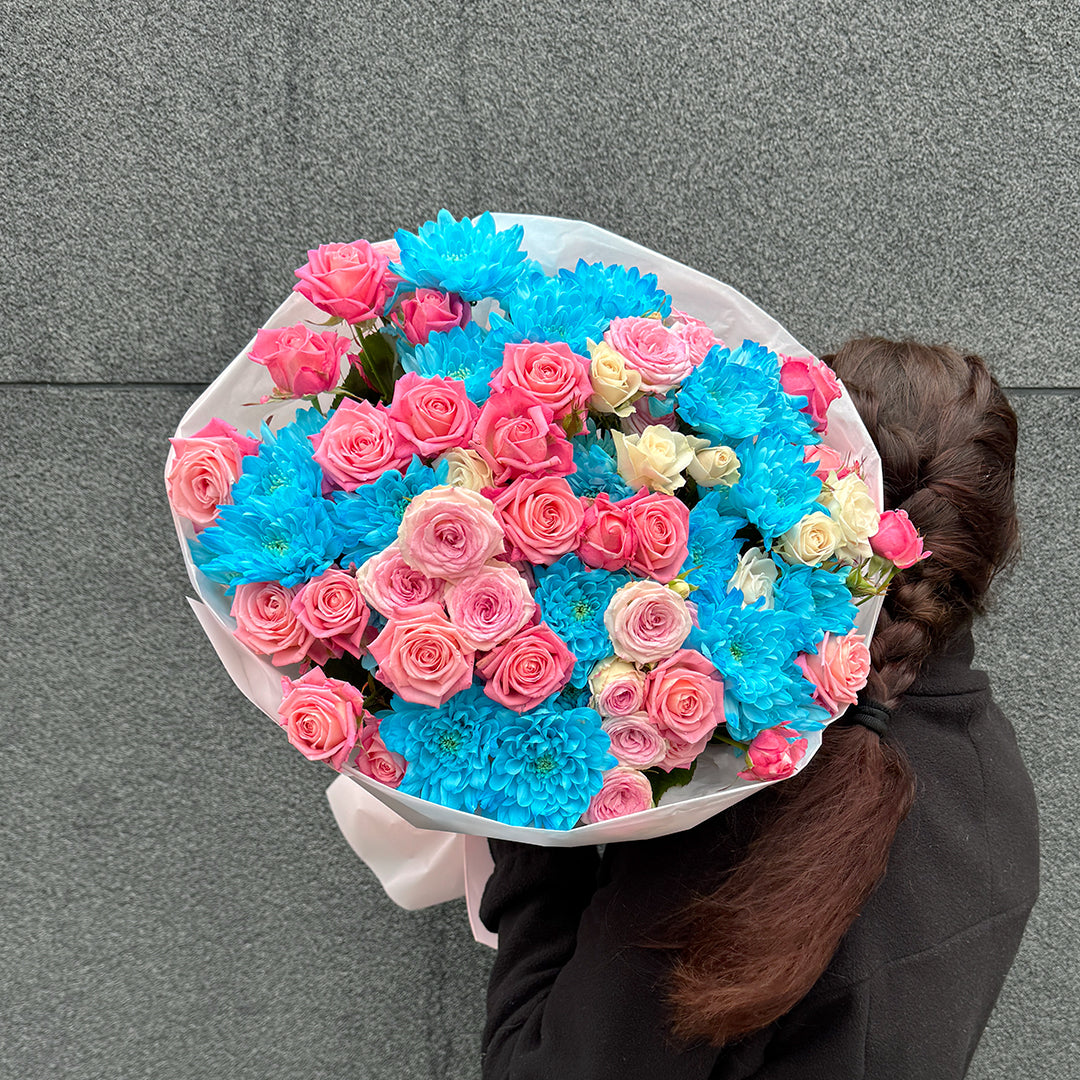 Niebieska chryzantema wprowadza nowoczesny, wyrazisty akcent, podczas gdy różowe róże gałązkowe dodają całości romantycznego ciepła i lekkości. Każdy bukiet powstaje ręcznie w naszej rodzinnej kwiaciarni Grand Flower, z najświeższych kwiatów premium, które dostarczamy na wodzie. To kompozycja, która przyciąga uwagę i zostaje w pamięci na długo.