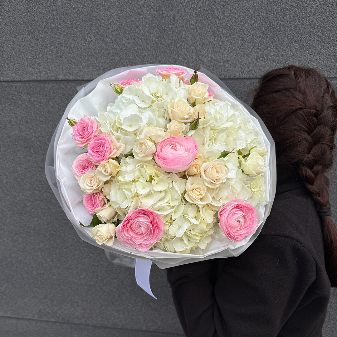 Bukiet z różowego ranunculusa, białej hortensji i róży gałązkowej