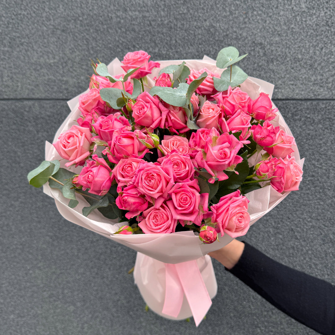 Букет из розовых кустовых роз и эвкалипта — современная и изысканная композиция в ярком, энергичном оттенке. Нежные цветы и свежий эвкалипт создают гармоничное сочетание, полное лёгкости и стиля. Идеальный выбор для дня рождения, годовщины, 8 Марта или просто как утончённый жест без повода.