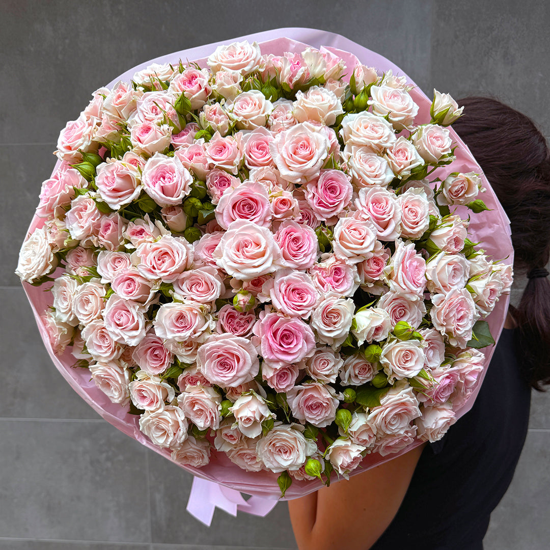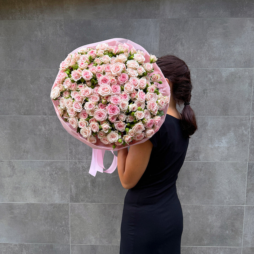 Букет із рожевих кущових троянд – ніжна, романтична композиція у пастельному відтінку рожевого. Символ вдячності, турботи й теплих почуттів. Ідеальний вибір для дня народження, річниці, іменин або як щирий подарунок без приводу.